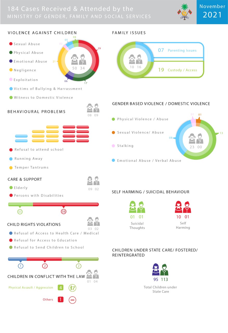 ނޮވެންބަރު 2021 ގައި މިނިސްޓްރީ އޮފް ޖެންޑަރ، ފެމިލީ އެންޑް ސޯޝަލް ސަރވިސަސްއަށް ޖުމްލަ 184 މައްސަލަ ރިޕޯޓުކޮށް އެޓެންޑްކޮށްފައިވެއެވެ.