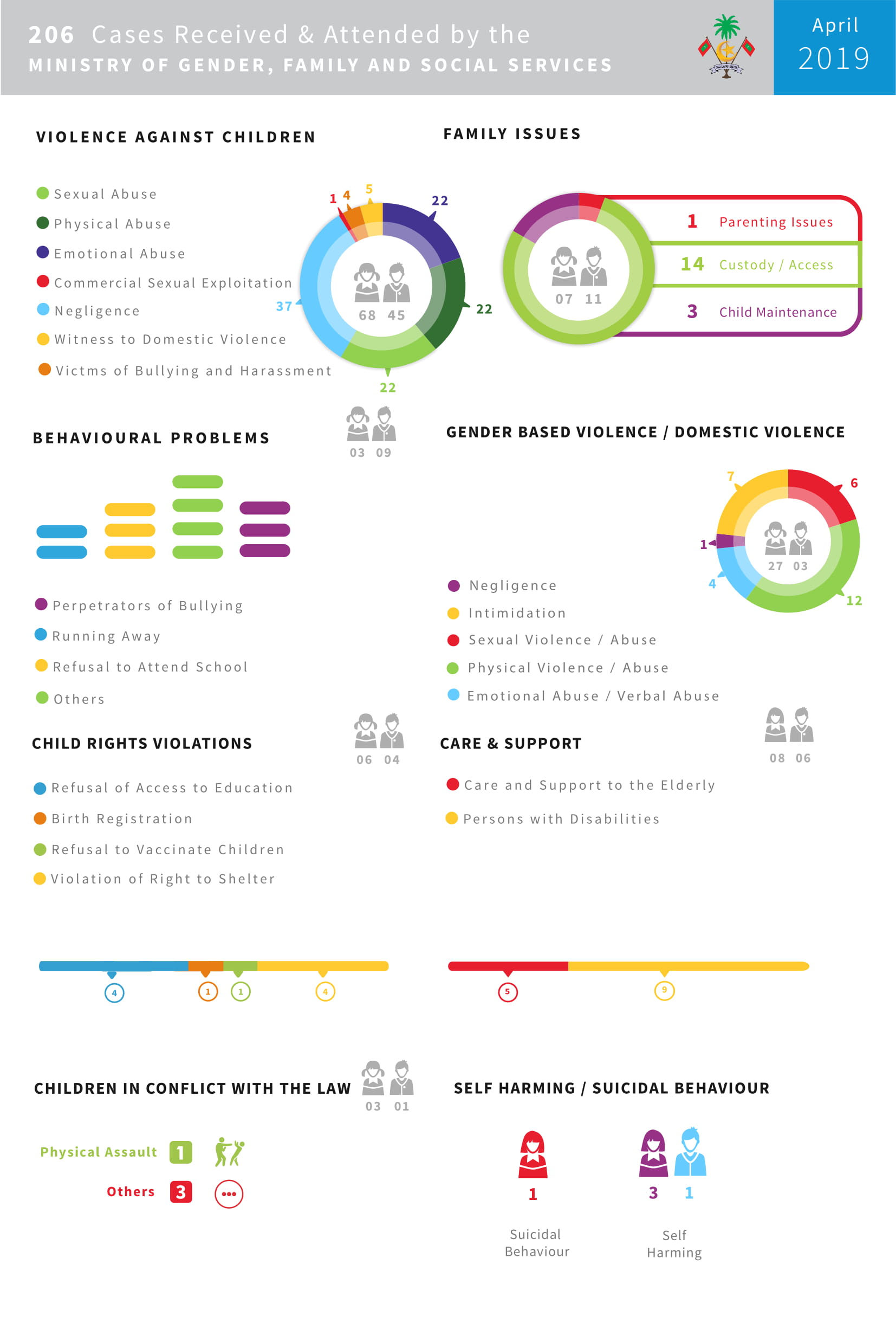 އެޕްރީލް 2019ގައި މިނިސްޓްރީ އޮފް ޖެންޑަރ، ފެމިލީ އެންޑް ސޯޝަލް ސަރވިސަސްއަށް ޖުމުލަ 206 މައްސަލަ ރިޕޯޓުކޮށް އެޓެންޑްކޮށްފައިވެއެވެ.