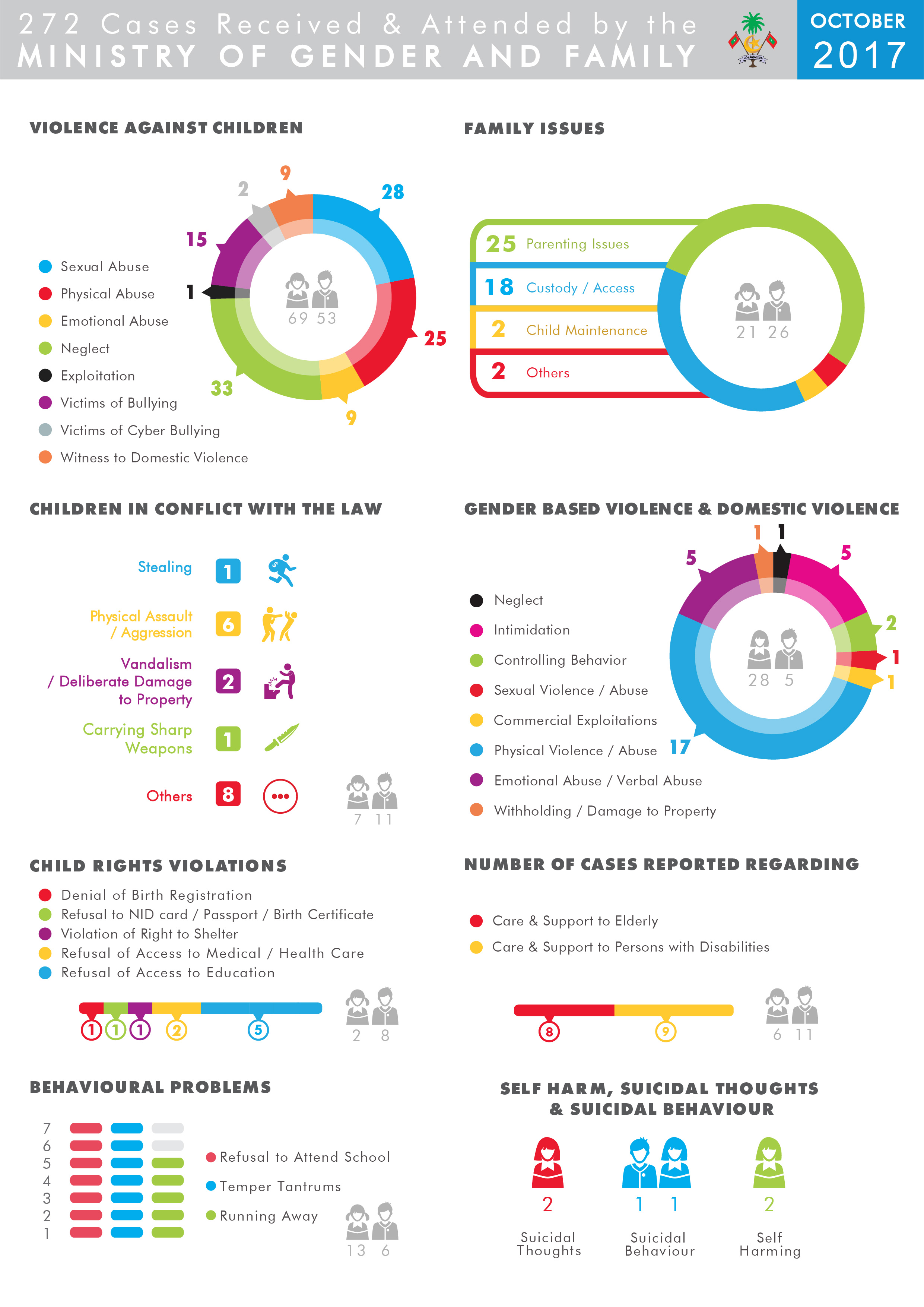 އޮކްޓޫބަރު 2017ގައި ޖުމްލަ 272 މައްސަލައެއް ވަނީ މިނިސްޓްރީ އޮފް ޖެންޑަރ އެންޑް ފެމިލީއަށް ރިޕޯޓުކޮށް އެޓެންޑްކޮށްފައެވެ.
