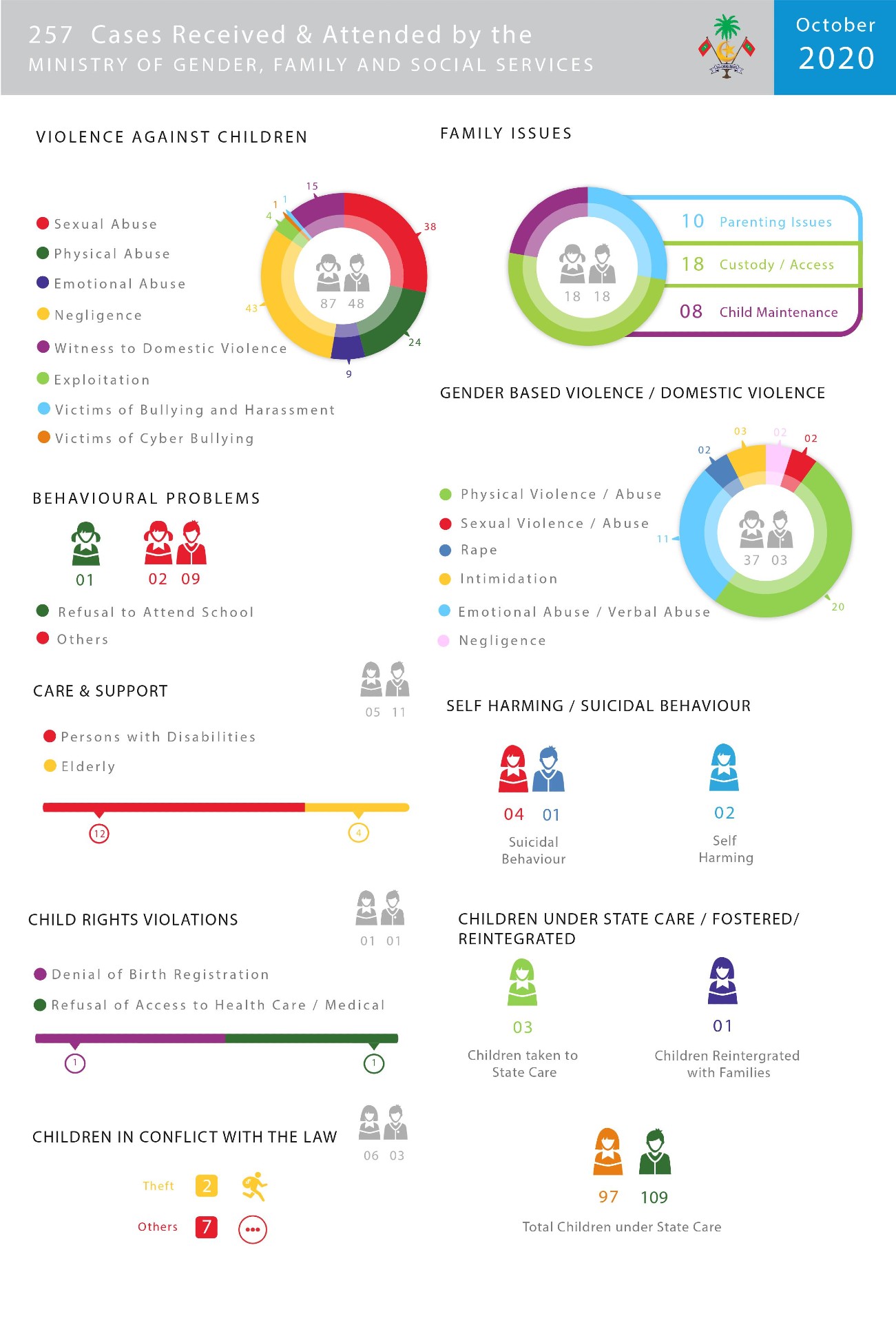 އޮކްޓޫބަރު 2020ގައި މިނިސްޓްރީ އޮފް ޖެންޑަރ، ފެމިލީ އެންޑް ސޯޝަލް ސަރވިސަސްއަށް ޖުމުލަ 257 މައްސަލަ ރިޕޯޓުކޮށް އެޓެންޑްކޮށްފައިވެއެވެ.