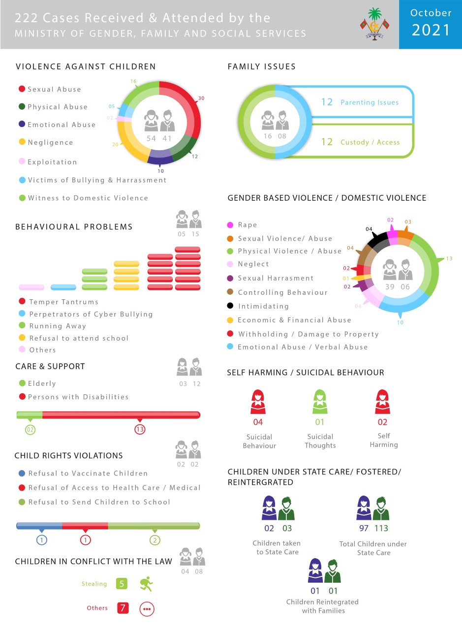 އޮކްޓޫބަރު 2021 ގައި މިނިސްޓްރީ އޮފް ޖެންޑަރ، ފެމިލީ އެންޑް ސޯޝަލް ސަރވިސަސްއަށް ޖުމްލަ 222 މައްސަލަ ރިޕޯޓުކޮށް އެޓެންޑްކޮށްފައިވެއެވެ.