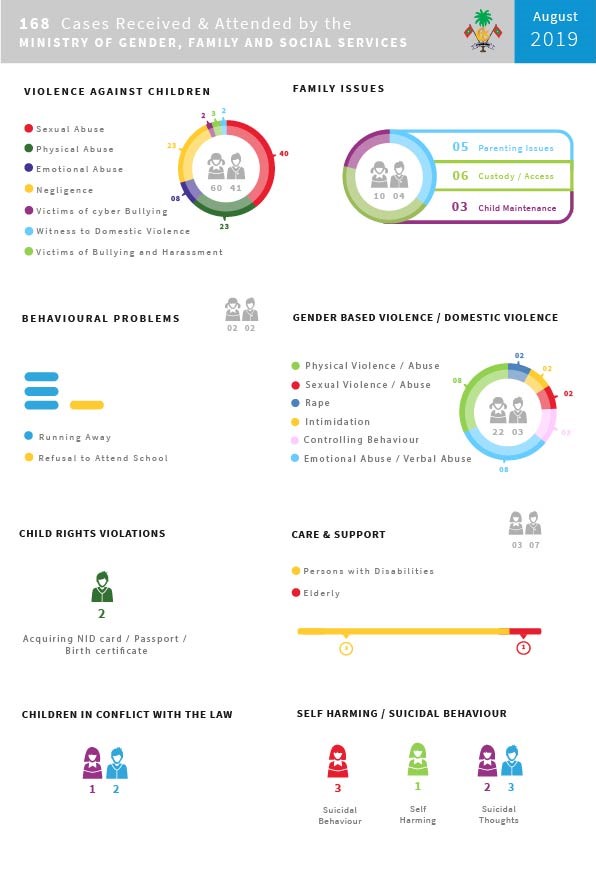 އޮގަސްޓު 2019ގައި މިނިސްޓްރީ އޮފް ޖެންޑަރ، ފެމިލީ އެންޑް ސޯޝަލް ސަރވިސަސްއަށް ޖުމުލަ 168 މައްސަލަ ރިޕޯޓުކޮށް އެޓެންޑްކޮށްފައިވެއެވެ. މިއީ ޖުލައި 2019ގައި ހުށަހެޅުނު ޖުމުލަ މައްސަލައަށް ވުރެ 21 އިންސައްތަ މަދު އަދަދެކެވެ. އަދި ޖޫން 2019ގައި ހުށަހެޅުނު ޖުމުލަ މައްސަލައަށް ވުރެ 30 އިންސައްތަ މަދު އަދަދެކެވެ.