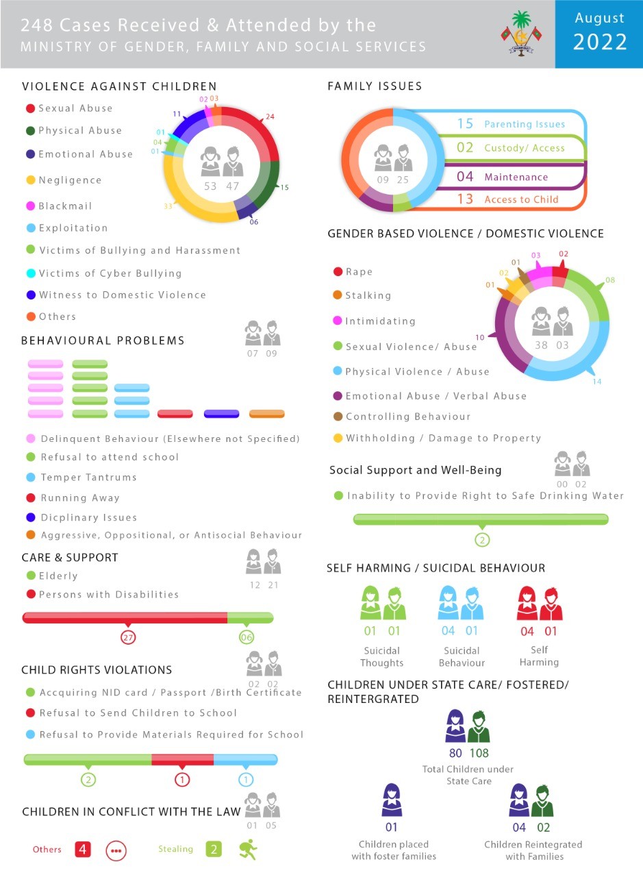 އޮގަސްޓު 2022 ގައި މިނިސްޓްރީ އޮފް ޖެންޑަރ، ފެމިލީ އެންޑް ސޯޝަލް ސަރވިސަސް އަށް ޖުމްލަ 248 މައްސަލަ ރިޕޯޓުކޮށް އެޓެންޑްކޮށްފައިވެއެވެ.