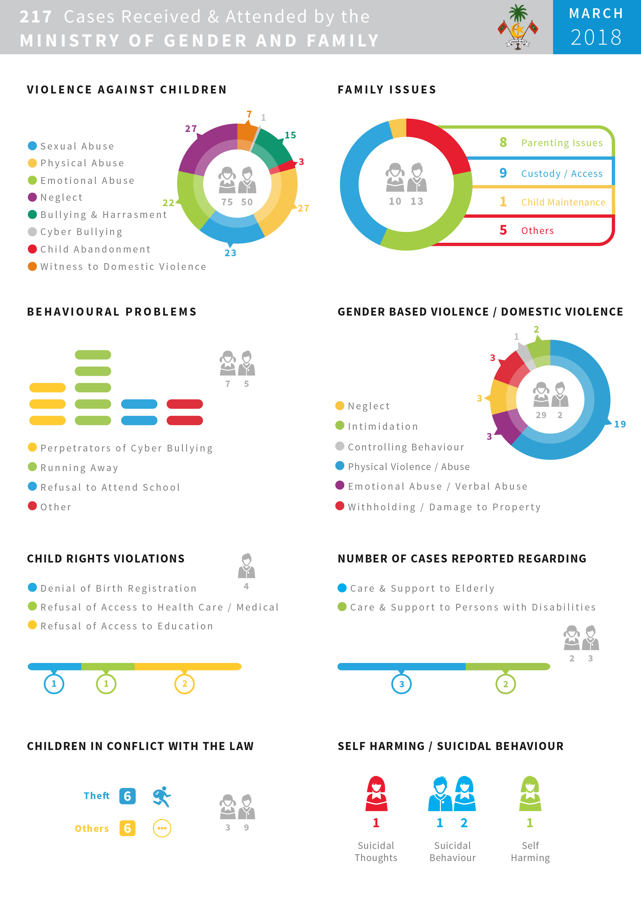 މާރިޗު 2018ގައި ޖުމުލަ 217 މައްސަލައެއް ވަނީ މިނިސްޓްރީ އޮފް ޖެންޑަރ އެންޑް ފެމިލީއަށް ރިޕޯޓުކޮށް އެޓެންޑްކޮށްފައެވެ.