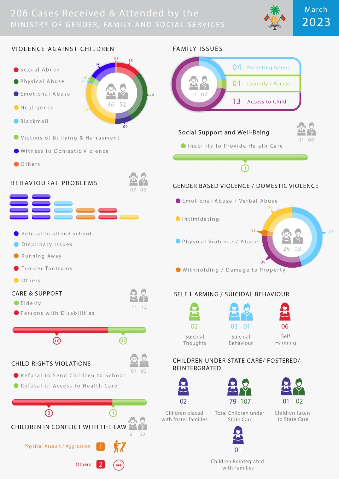 މާރިޗު 2023 ގައި މިނިސްޓްރީ އޮފް ޖެންޑަރ، ފެމިލީ އެންޑް ސޯޝަލް ސަރވިސަސް އަށް ވަނީ ޖުމްލަ 206 މައްސަލަ ރިޕޯޓުކޮށް އެޓެންޑްކޮށްފައެވެ.