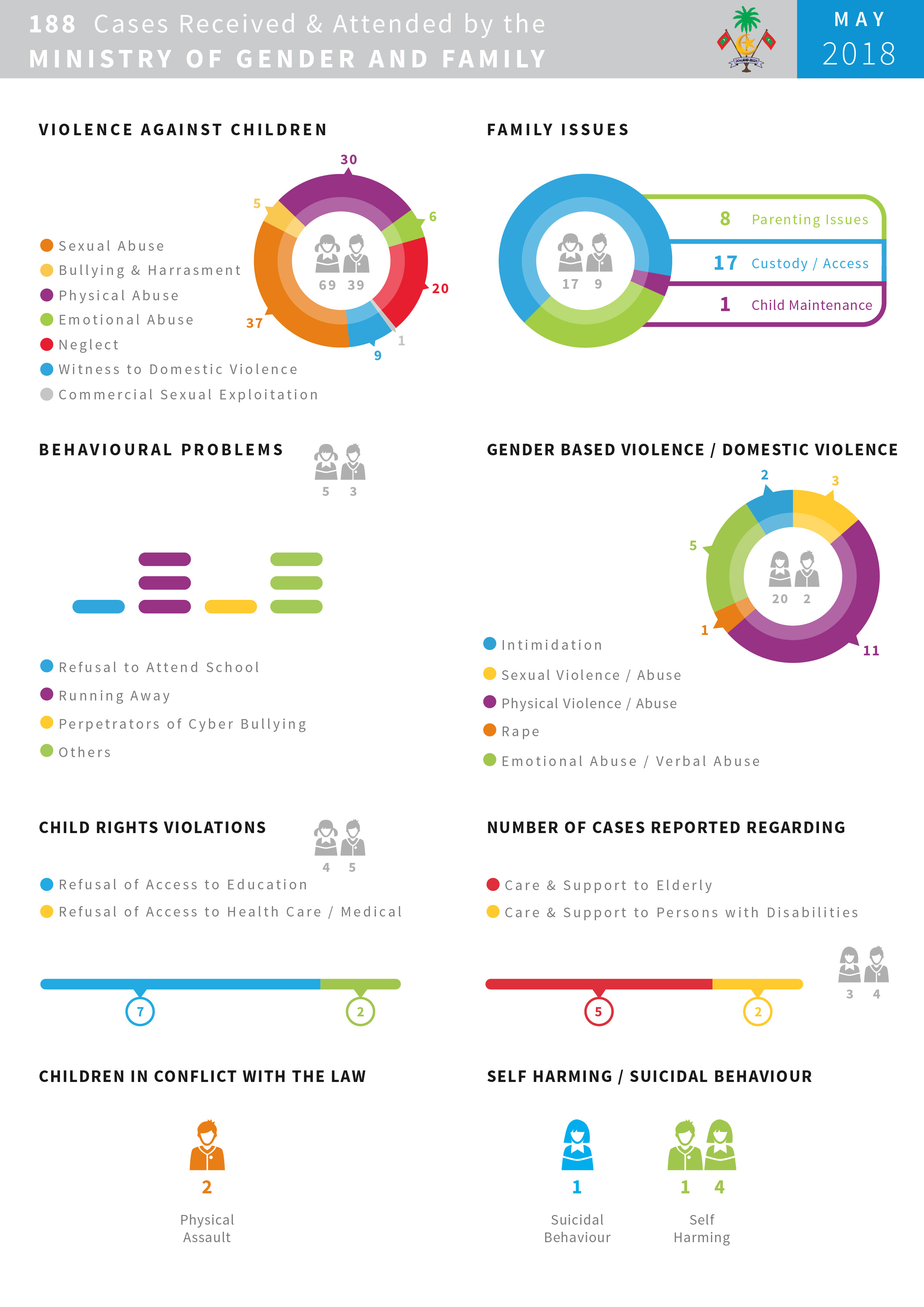 މޭ 2018ގައި މިނިސްޓްރީ އޮފް ޖެންޑަރ އެންޑް ފެމިލީއަށް ޖުމުލަ 188 މައްސަލަ ރިޕޯޓުކޮށް އެޓެންޑްކޮށްފައިވެއެވެ.