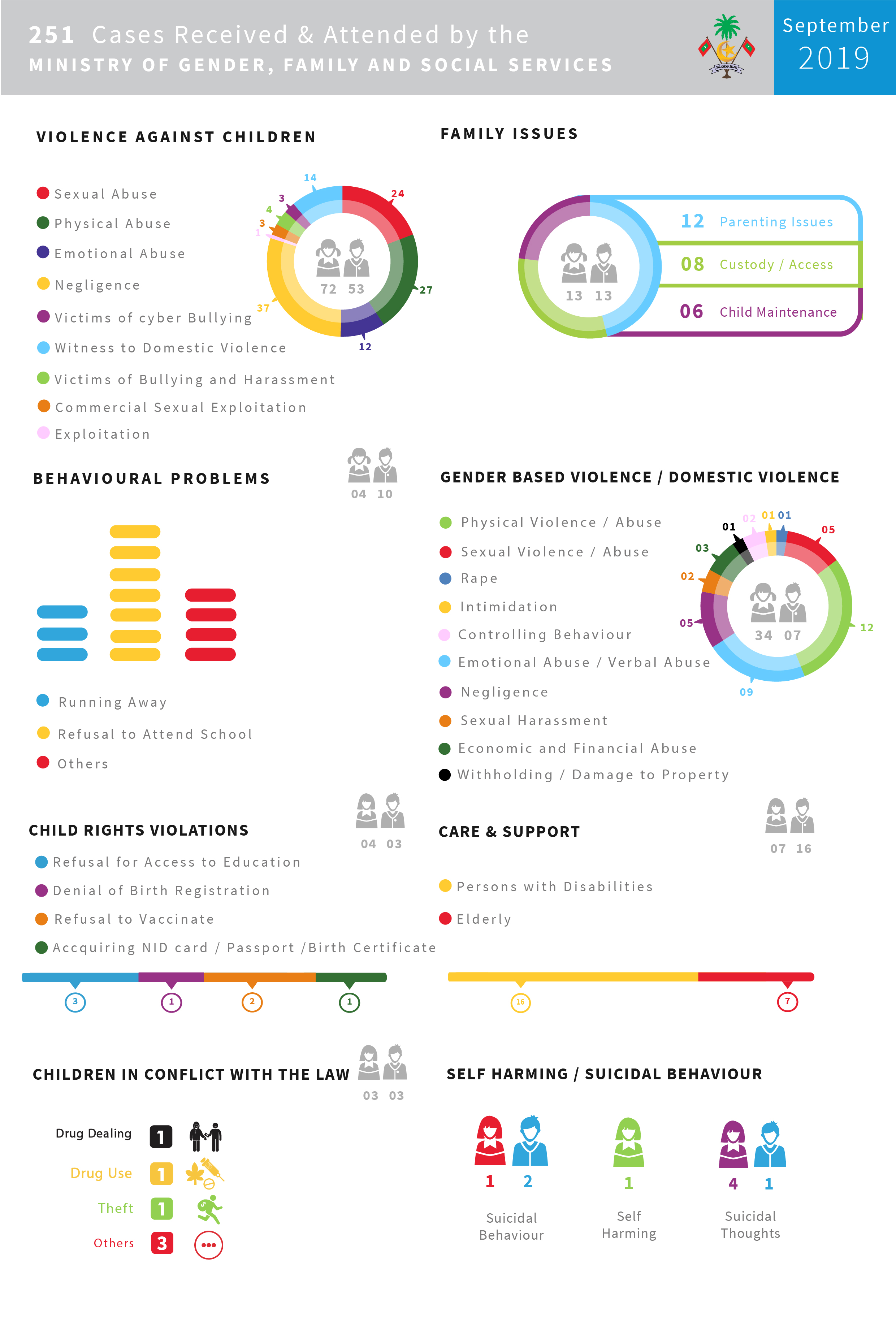 ސެޕްޓެންބަރު 2019ގައި މިނިސްޓްރީ އޮފް ޖެންޑަރ، ފެމިލީ އެންޑް ސޯޝަލް ސަރވިސަސްއަށް ޖުމުލަ 251 މައްސަލަ ރިޕޯޓުކޮށް އެޓެންޑްކޮށްފައިވެއެވެ.