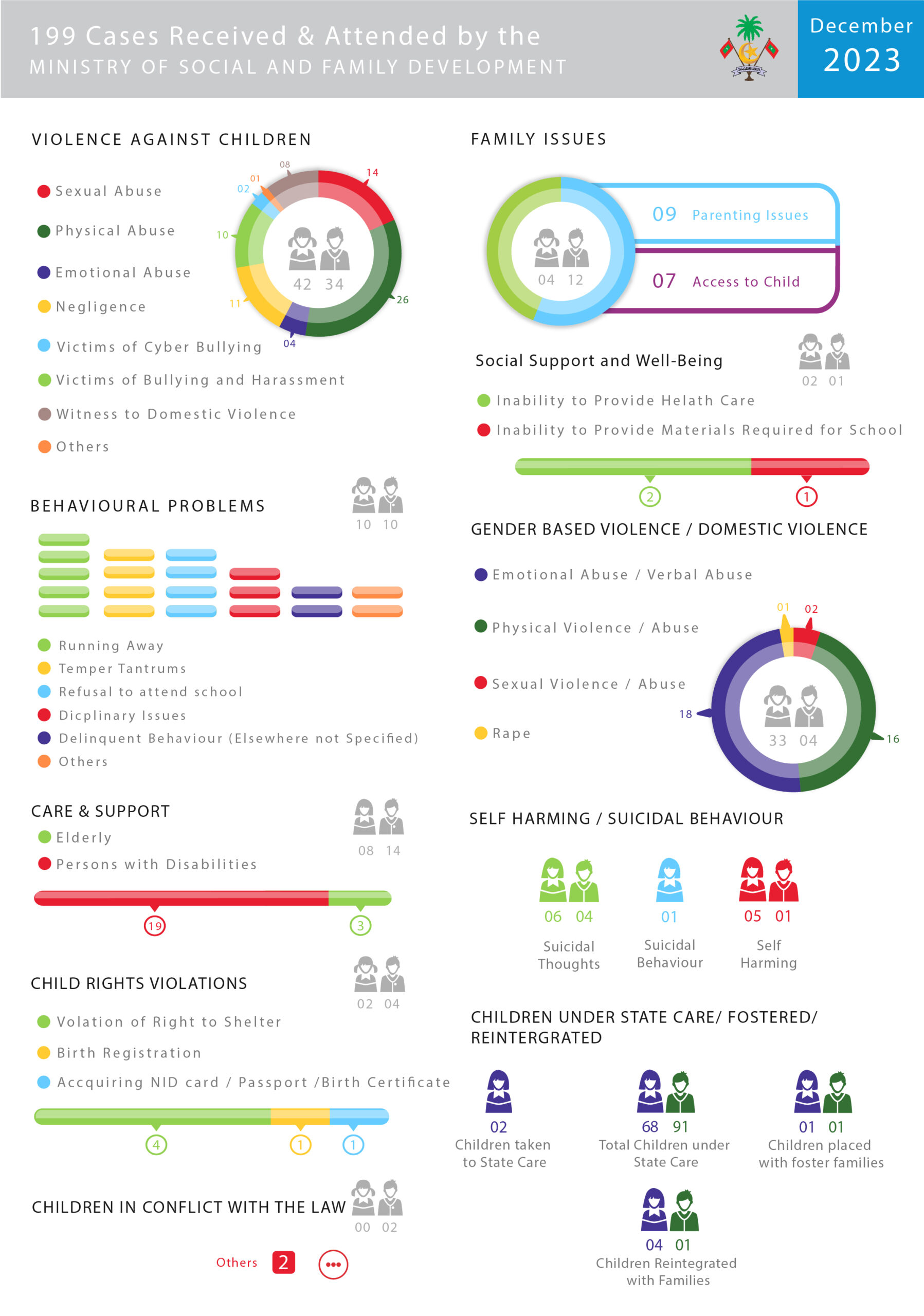 - ޑިސެންބަރ މަހުގެ ނިޔަލަށް ދައުލަތުގެ ބެލުމުގެ ދަށުގައި ތިބި ކުދިންގެ ޖުމުލަ ޢަދަދަކީ 159 އެވެ. ދައުލަތަށް އަލަށް 2 ކުއްޖަކު ނެގިފައިވާއިރު، 5 ކުއްޖަކު އާއިލާއަށް ރީއިންޓަރގްރޭޓް ކުރެވި، 2 ކުއްޖަކު ފޮސްޓަރކުރެވުނެވެ.