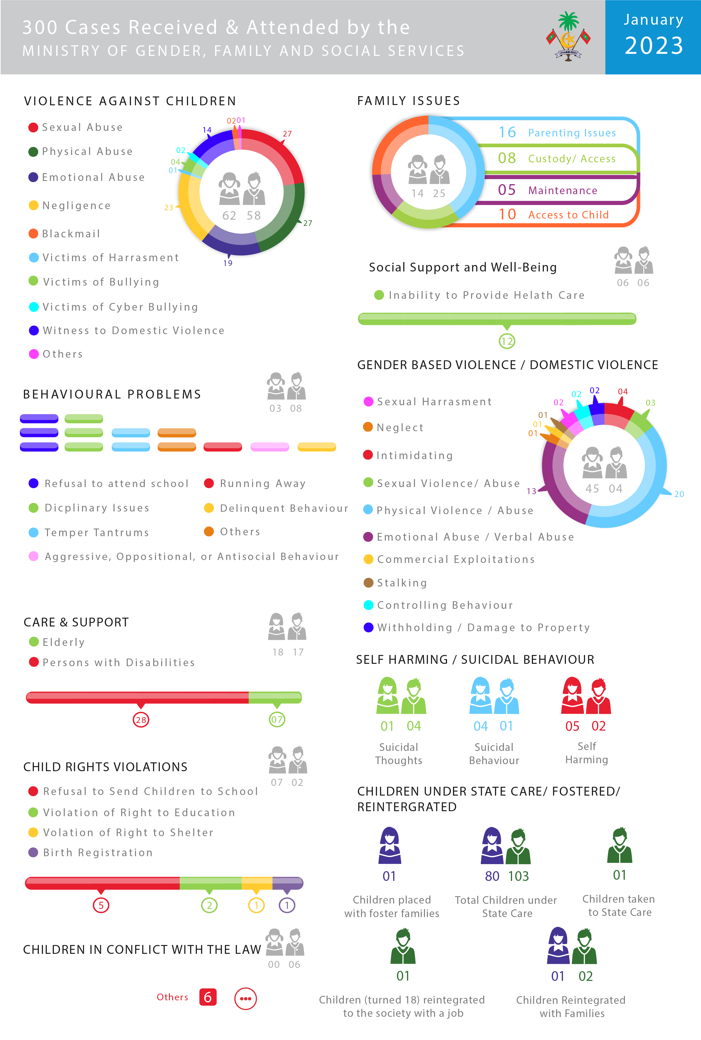 ޖަނަވަރީ 2023 ގައި މިނިސްޓްރީ އޮފް ޖެންޑަރ، ފެމިލީ އެންޑް ސޯޝަލް ސަރވިސަސް އަށް ޖުމްލަ 300 މައްސަލަ ރިޕޯޓުކޮށް އެޓެންޑްކޮށްފައިވެއެވެ.
