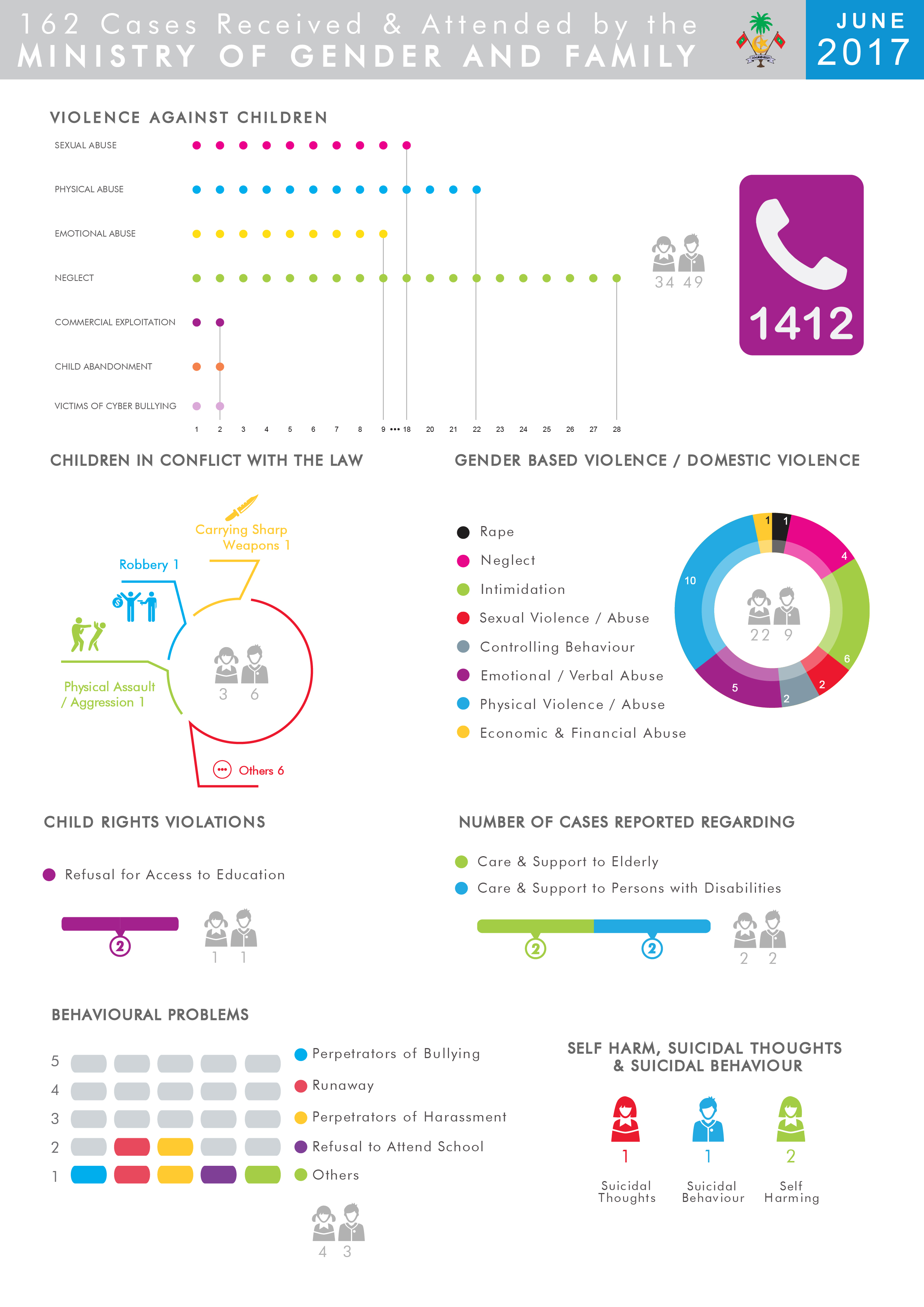 ޖޫން 2017 ގައި ޖުމްލަ 162 މައްސަލައެއް ވަނީ މިނިސްޓްރީ އޮފް ޖެންޑަރ އެންޑް ފެމިލީއަށް ރިޕޯޓްކޮށް އެޓެންޑްކޮށްފައެވެ.