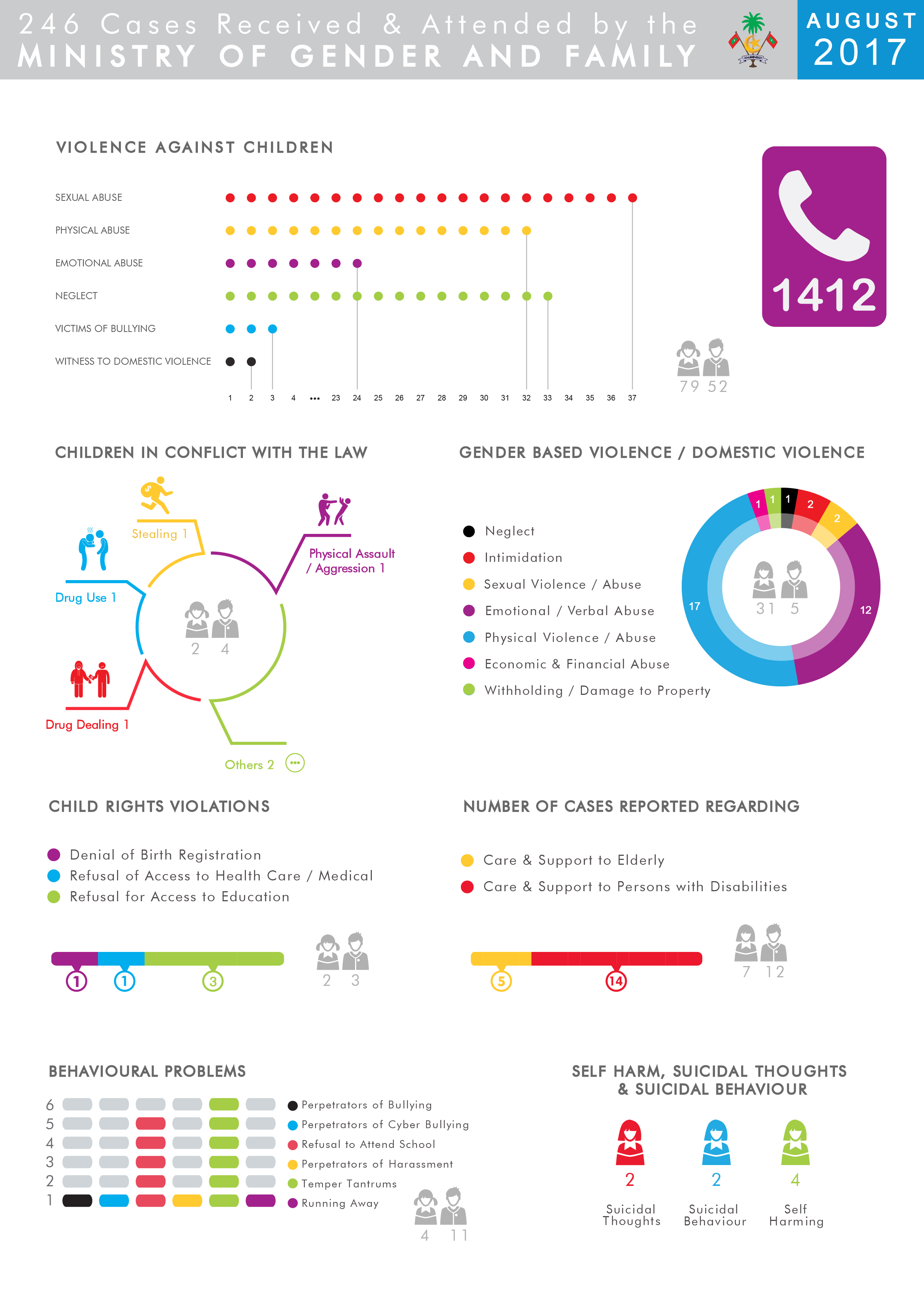 Ministry of Gender and Family received and attended to a total of 246 cases in August 2017.