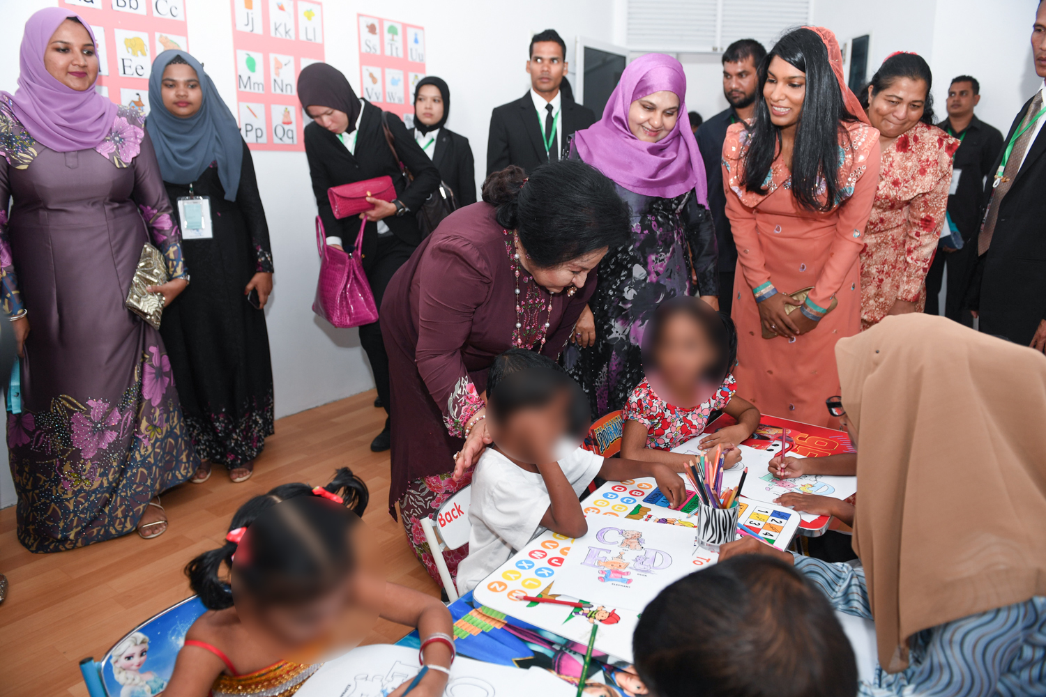 First Lady of the Maldives H.E. Madam Fathimath Ibrahim and First Lady of Malaysia H.E. Datin Paduka Rosmah Mansor paid a visit to Fiyavathi shelter in Hulhumale’ this morning. The First Ladies were received at the shelter by the Minister of Gender and Family H.E. Zenysha Shaheed Zaki.