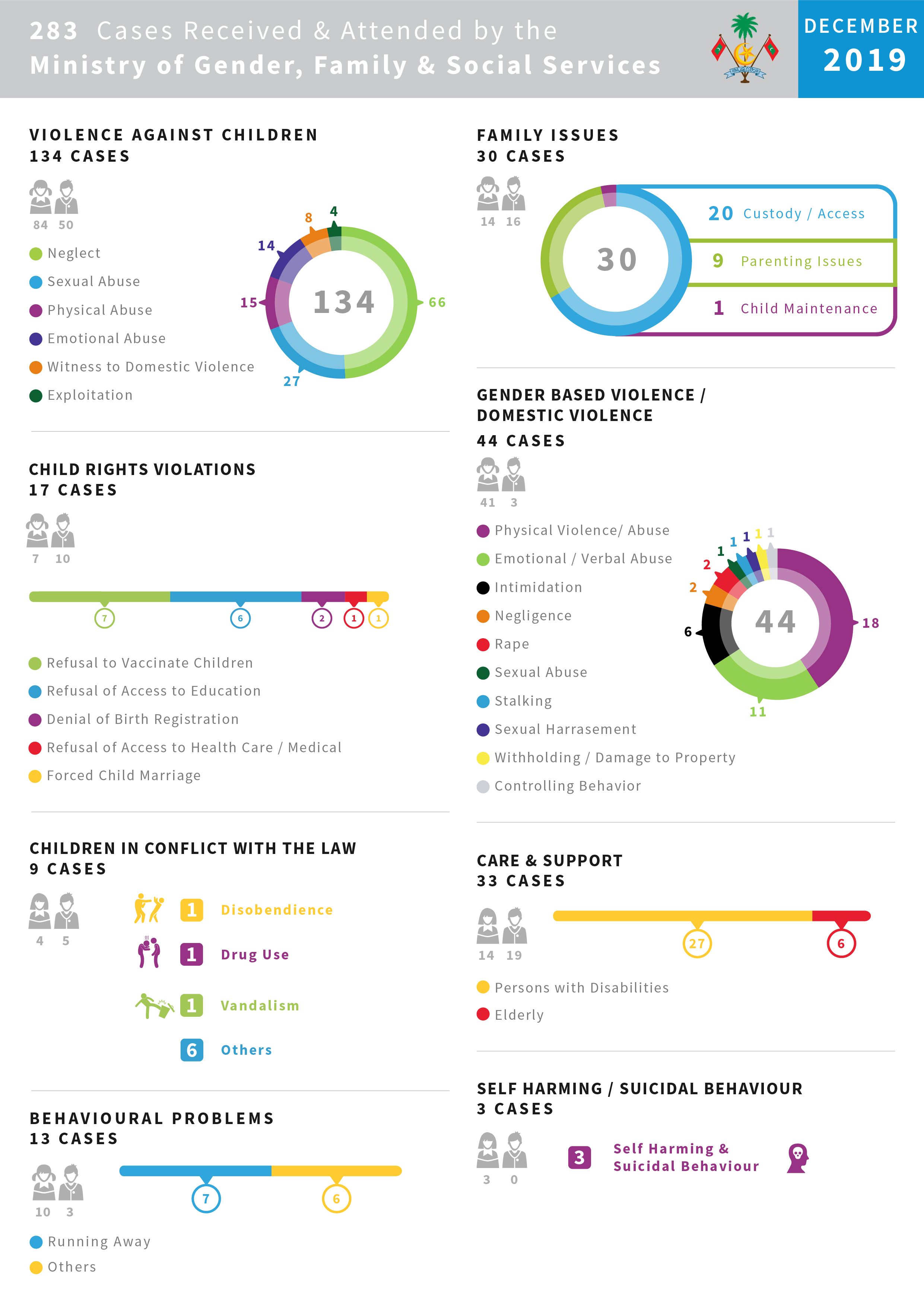 Ministry of Gender, Family and Social Services received and attended to a total of 283 cases in December 2019.