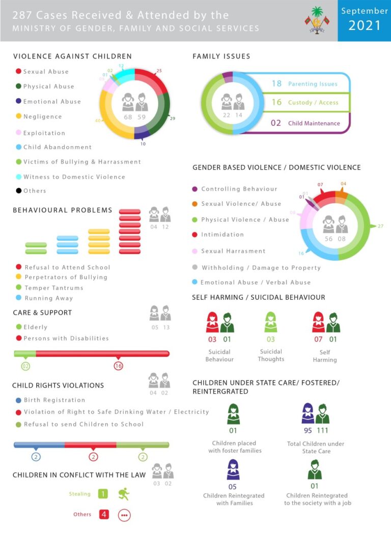 Ministry of Gender, Family and Social Services received and attended to a total of 287 cases in September 2021.